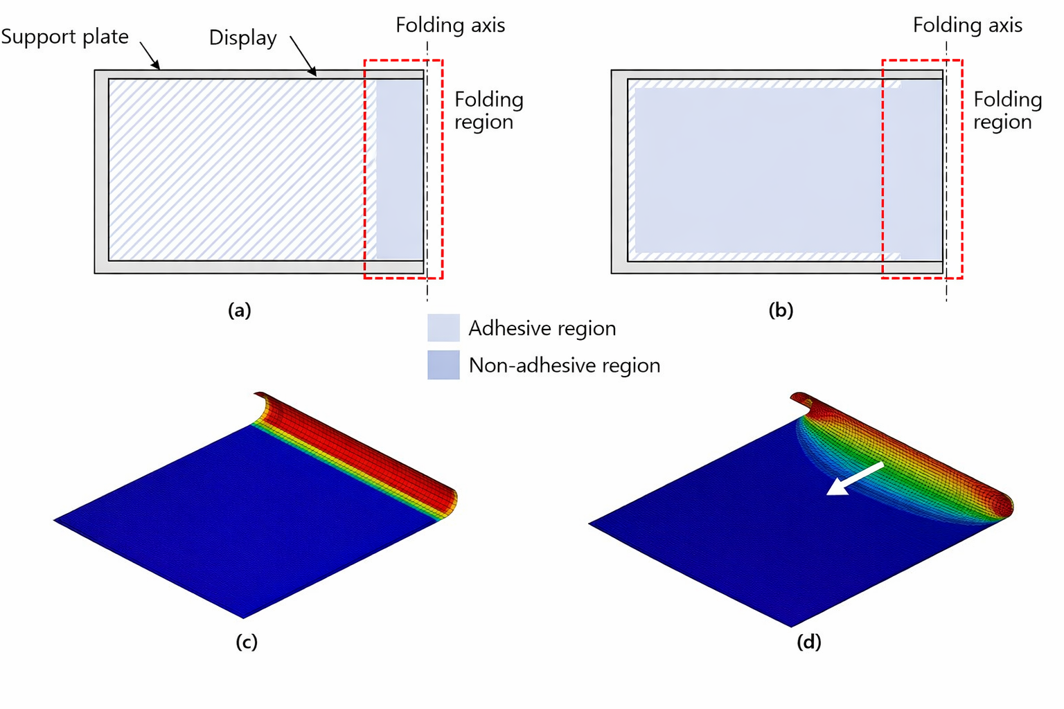 Core idea of the invention: (a) Adhesive and non-adhesive areas of a conventional foldable smartphone, (b) Adhesive and non-adhesive areas in this invention, (c) Stress distribution in a conventional foldable smartphone display, (d) Stress distribution in a foldable smartphone display applying this technology