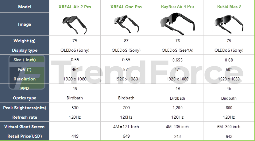 Video-centric AR glasses are designed to deliver high-resolution, highly immersive personal viewing experiences. They primarily target business professionals with limited living space or frequent travel needs, as well as consumers who place a premium on gaming and audiovisual content. For this demographic, the core selling points are display performance, including higher PPD (pixels per degree), a wider FoV (field of view), and superior color rendering and image quality, rather than AI assistant functionality. TrendForce indicates that forcing edge AI integration could be counterproductive, leading to increased overall device weight, shorter battery life, and inflated costs.