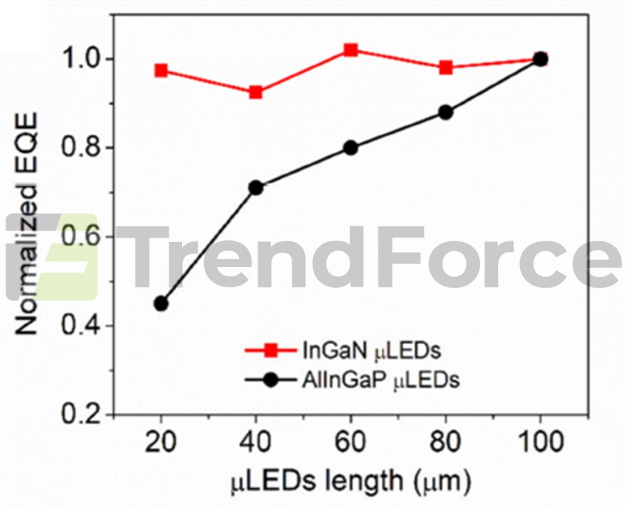 AlInGaP-based red LED technology is still commonplace in the market at this stage. Nonetheless, with shrinking pixel sizes, its external quantum efficiency (EQE) is on a steep decline due to increasing sidewall defects and surface recombination effects, further hindering the technology’s use in high-resolution AR display applications.